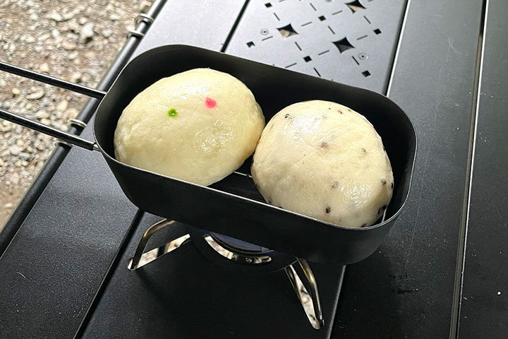 さっき買った、チャーちゃんまんじゅうの餃子味とネギ味噌味。