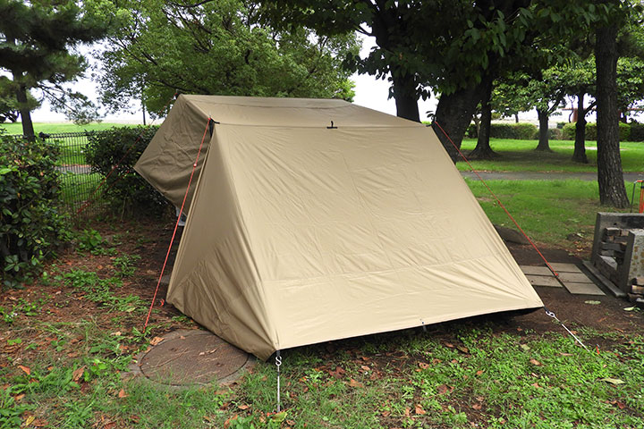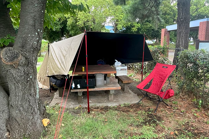 木陰のサイトだったけど、雨降るので備え付けのテーブルの上にマンタフライ。